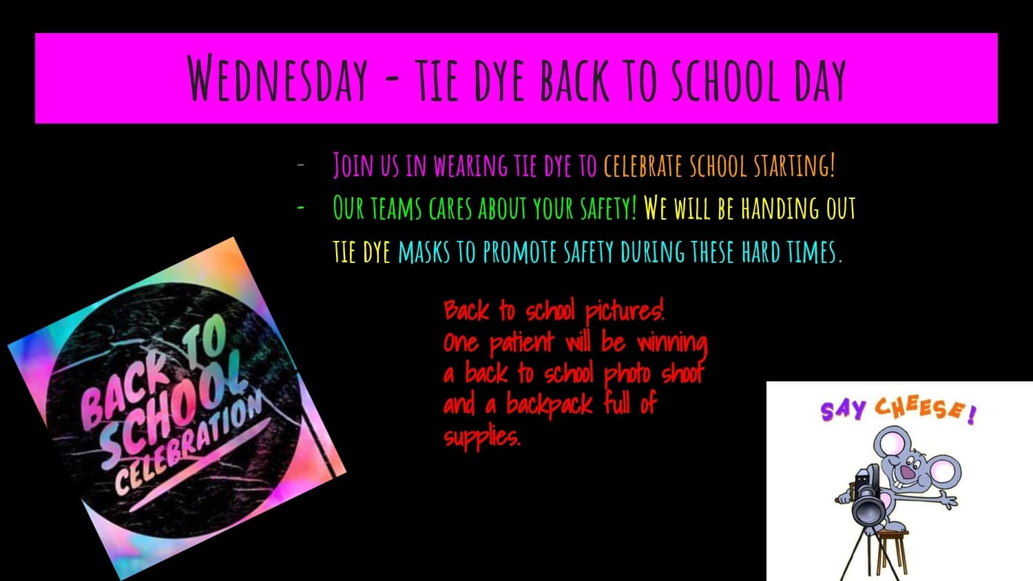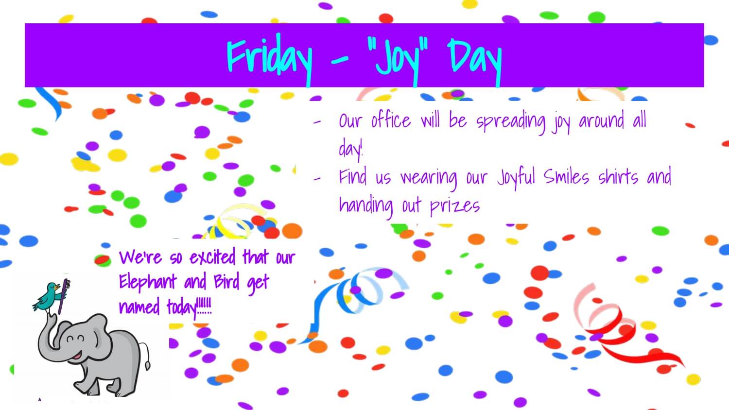 Spirit week; full of joy and prizes! Prizes Will be given ONLINE and IN-OFFICE!
